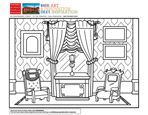 This coloring sheet is a graphic interpretation of the furniture from Walt Disney’s apartment at Disneyland. These original pieces can be seen on display in our museum’s Awards Lobby.