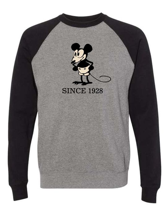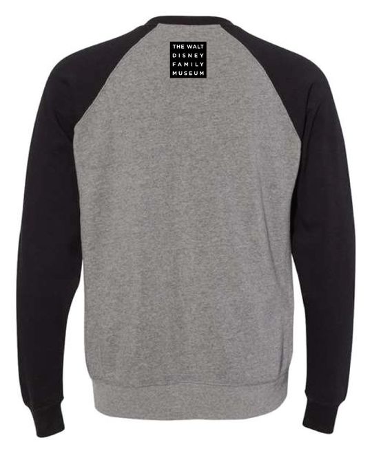Exclusive design for The Walt Disney Family Museum. This raglan style crewneck sweatshirt features the museum’s logo on the upper back in heather gray, black sleeves, and a sketch of the earliest known drawing of Mickey Mouse, dated from 1928 and on display in The Walt Disney Family Museum’s galleries.