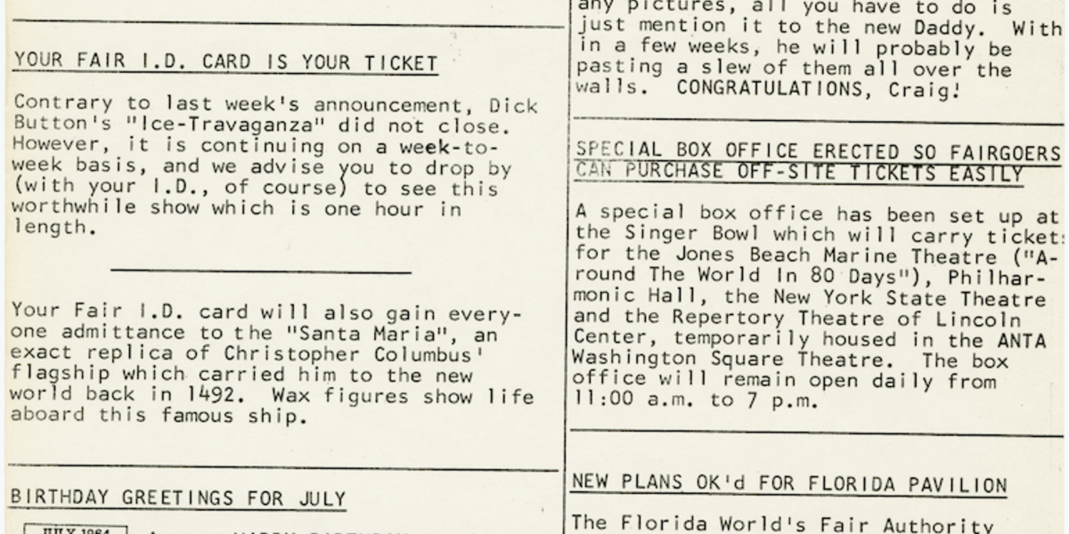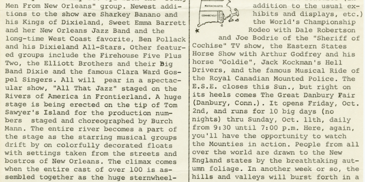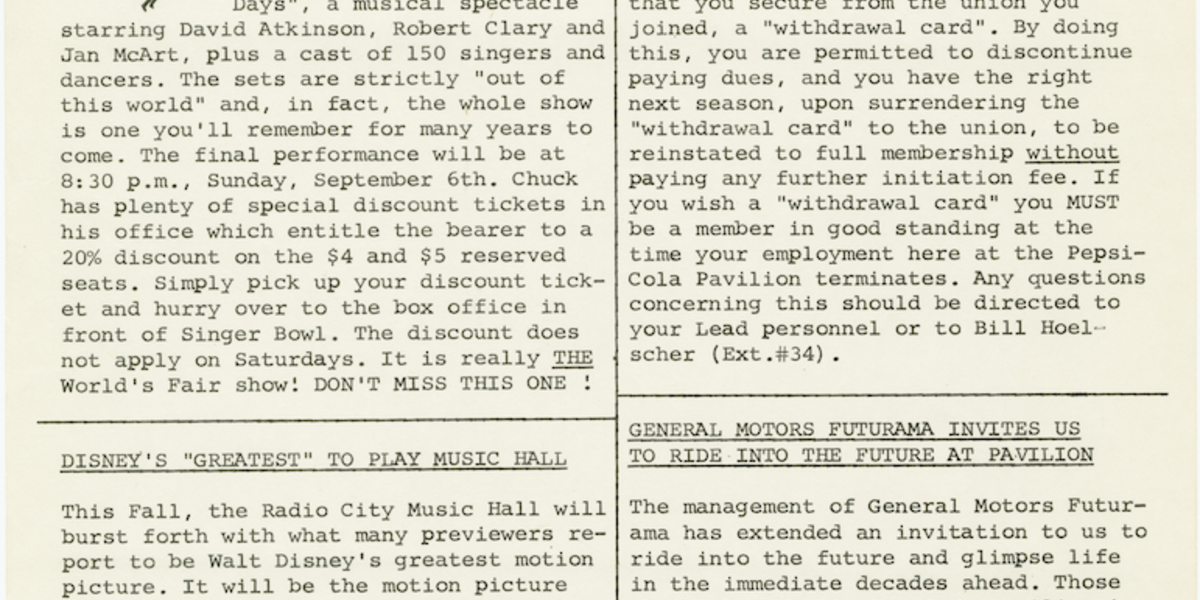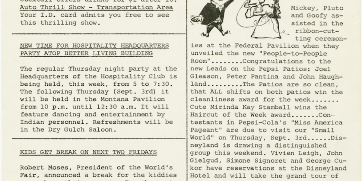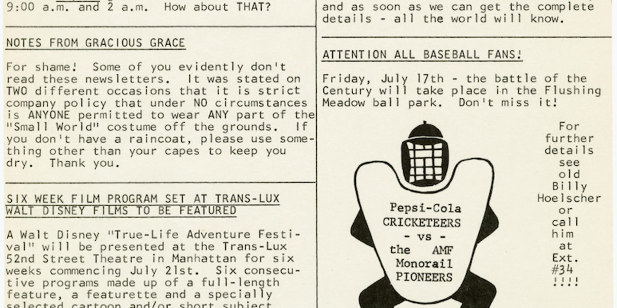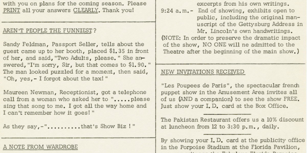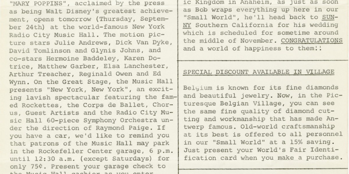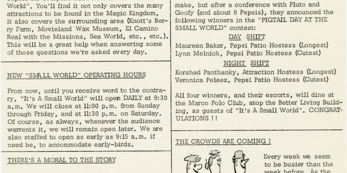 That’s why I love reading these newsletters from the original it’s a small world exhibit at the 1964/65 New York World’s Fair. I feel like a time traveler visiting those cast members who helped guide the world’s experience of this iconic attraction for the first time. Here you’ll find the results of a pigtail contest, a birth announcement, which side of the costume Pepsi-Cola name tags were to be worn, news about Mary Poppins(just before its spectacular premiere in theaters), and an invite for small world cast members to preview another famous Walt Disney fair exhibit, Great Moments with Mr. Lincoln.