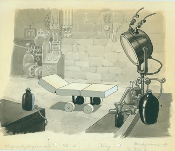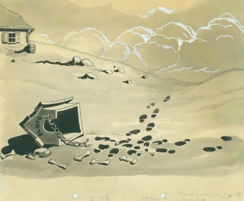 These two background drawings for The Mad Doctor (1933) provide the perfect setting for Mickey’s nightmare where Pluto gets kidnapped by an evil scientist. Seen alone, without the overylay of figures on cels, the scene has a desolate feeling that makes the whole effect even creepier.
