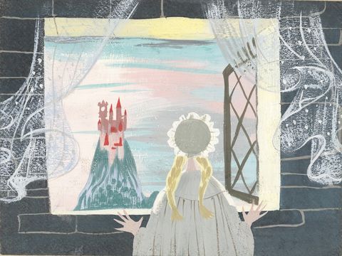 • Visual development art - Cinderella looking at castle, Cinderella, 1950; collection of the Walt Disney Family Foundation, from the Estate of Mary Blair; © Disney