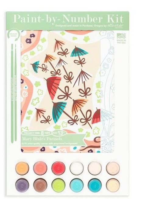Exclusive for the Mary Blair: Mid-Century Magic special exhibition. Mary Blair’s Parasols paint-by-number kit features textile art by the mid-century art of Mary Blair, known for her imaginative, bold color pairings and joyful, whimsically stylized illustrations. This art features parasols and florals in Mary Blair’s signature color styling. Completing the 12-color acrylic painting can take between 12–14 hours. This paint-by-number kit is recommended for adults and teens age 13+.